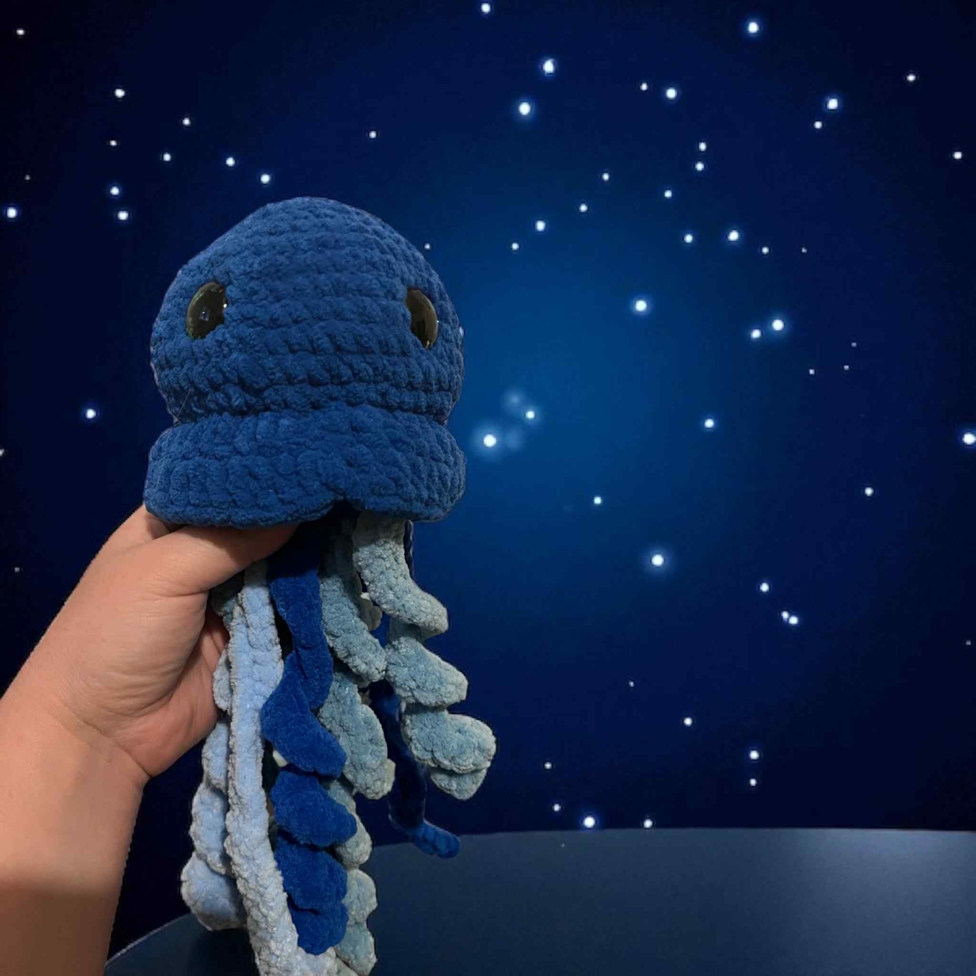 Laissez-vous séduire par cette méduse en crochet, entièrement faite à la main avec un fil chenille tout doux certifié Oeko-Tex. Avec sa tête toute ronde, ses grands yeux brillants et ses longues tentacules moelleuses, elle évoque la magie de l’océan tout en apportant une touche de tendresse à votre quotidien. Parfaite pour une chambre d’enfant, une déco marine ou un cadeau unique et fait main !